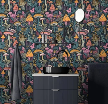Coloful Pink/Yellow/Red Magical Mushroom Forest Wallpaper Vintage Wall Paper for Renter