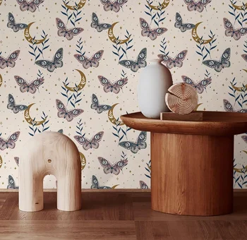 Boho Golden Stars Moon Butterfly Leaf Wall Paper for Bedroom Cabinet Renter Friendly